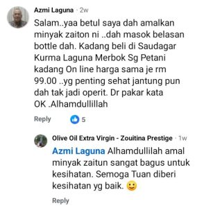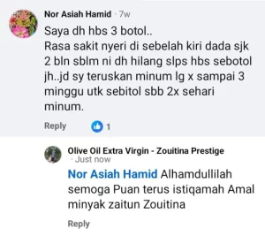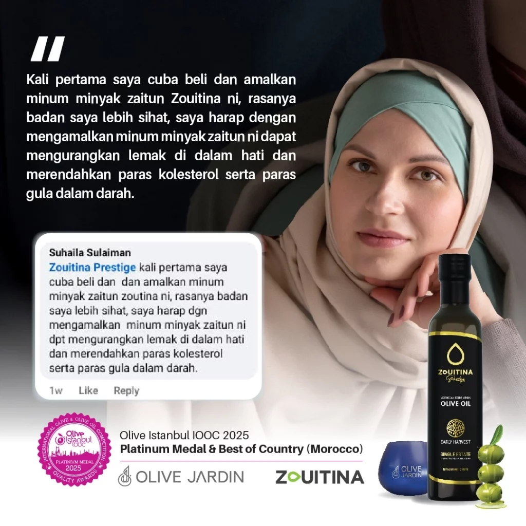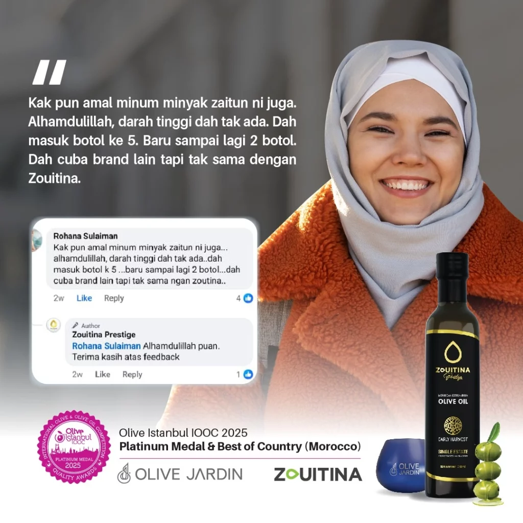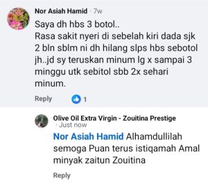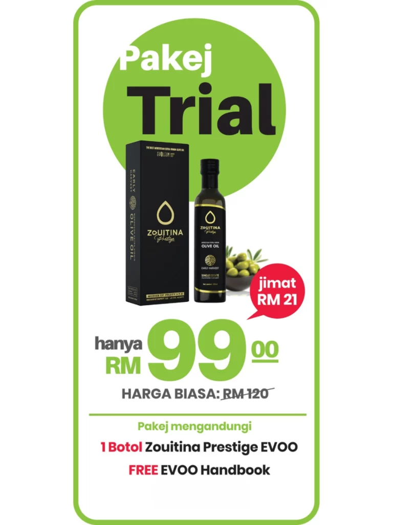 1 botol Zoutina Prestige Extra Virgin Olive Oil adalah 250ml, jadi jika mengikut cara penggunaan kami, 1 botol akan bertahan selama 1 minggu.